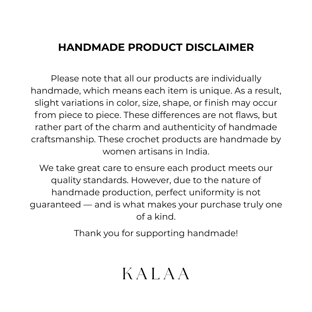 Please note that all our products are individually handmade,which means each item is unique. As a result, slight variations in color, size, shape,or finish may occur from piece to piece. These differences are not flaws,but rather part of the charm and authenticity of handmade craftsmanship. These crochet products are handmade by women artisans in India.