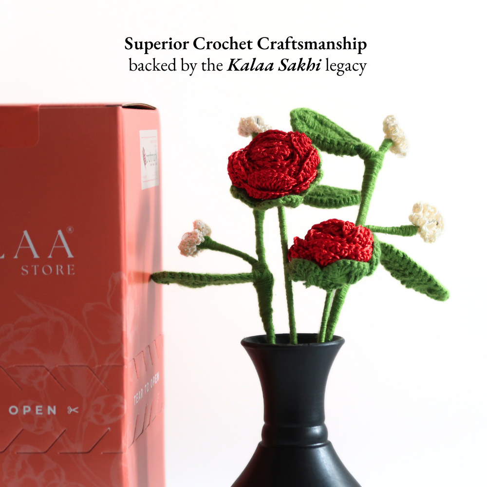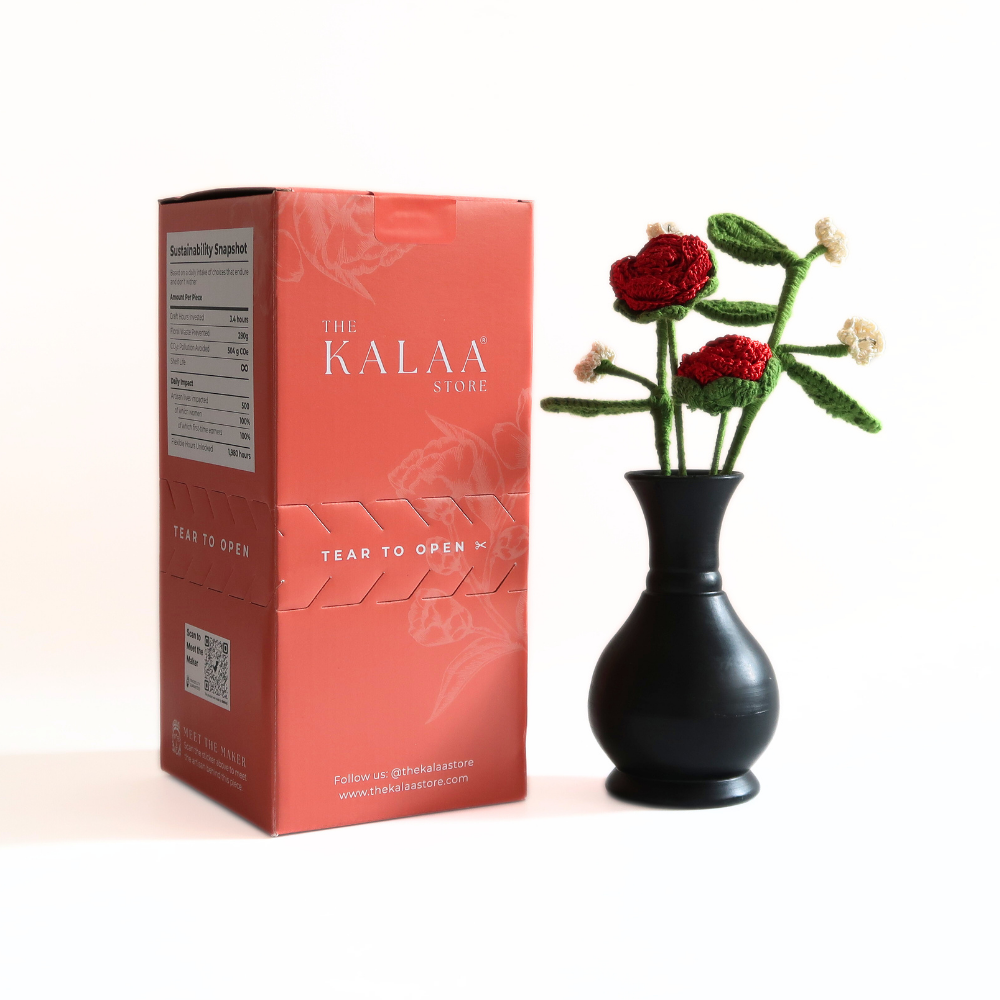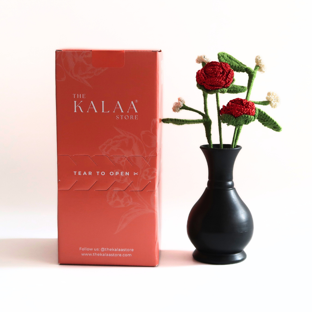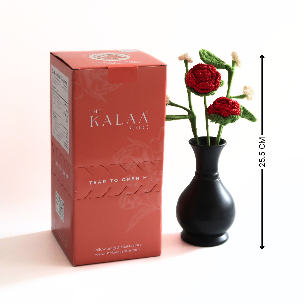 The Kalaa Store Signature Crochet Rose Bouquet is ‘Forever in Bloom’. Featuring three handcrafted red roses with delicate beaded baby’s breath in a hand-painted black vase, each bouquet reflects over 3.6 hours of artisan craftsmanship. Durable, non-perishable, and ethically made, it’s a timeless gift or décor piece that adds warmth and elegance to any space.