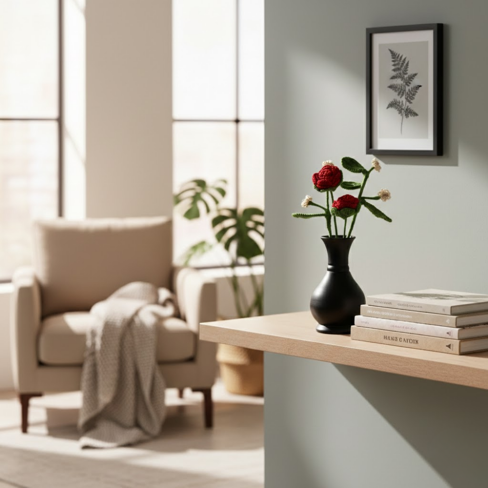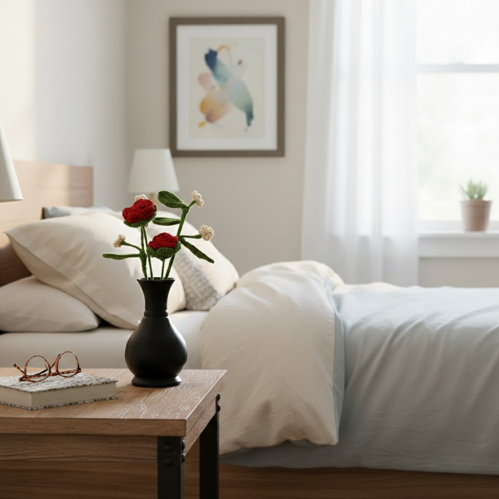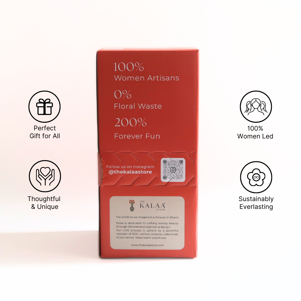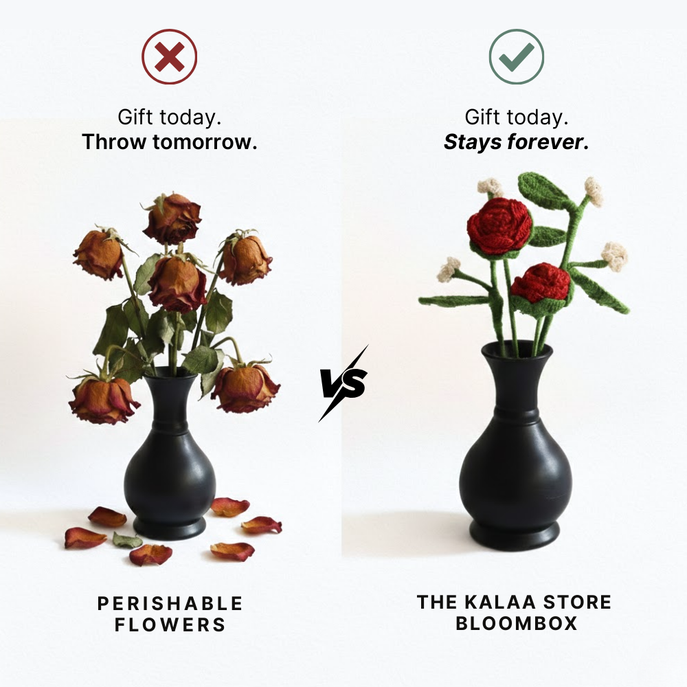 The Kalaa Store Signature Crochet Rose Bouquet is ‘Forever in Bloom’. Featuring three handcrafted red roses with delicate beaded baby’s breath in a hand-painted black vase, each bouquet reflects over 3.6 hours of artisan craftsmanship. Durable, non-perishable, and ethically made, it’s a timeless gift or décor piece that adds warmth and elegance to any space.