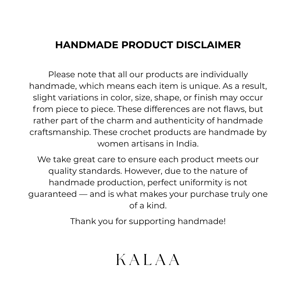Please note that all our products are individually handmade,which means each item is unique. As a result, slight variations in color, size, shape,or finish may occur from piece to piece. These differences are not flaws,but rather part of the charm and authenticity of handmade craftsmanship. These crochet products are handmade by women artisans in India.